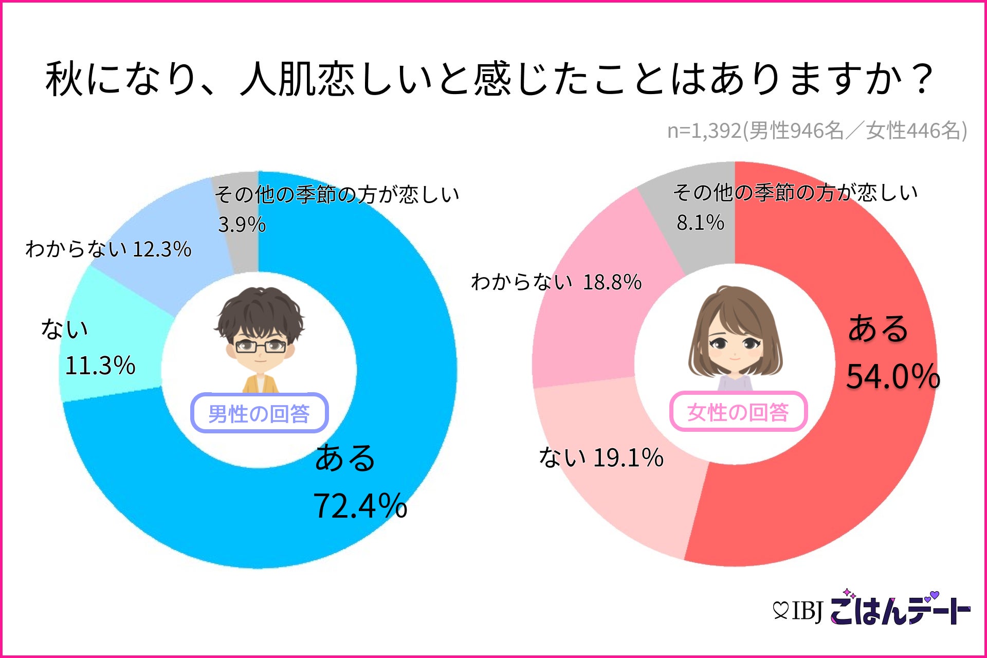 秋になり『人肌恋しい』と答えた男性が72.4%に対し、女性は54.0%という結果に。クリスマスまでに恋人が欲しい、と考える独身男女は多いですが、男性のほうがクリスマスを意識するのが早いのかもしれません。クリスマスまで残り2か月となり、男女共に新しい出会いへの気持ちが高まっている今、恋活・婚活を始めるには絶好の時期と言えます。