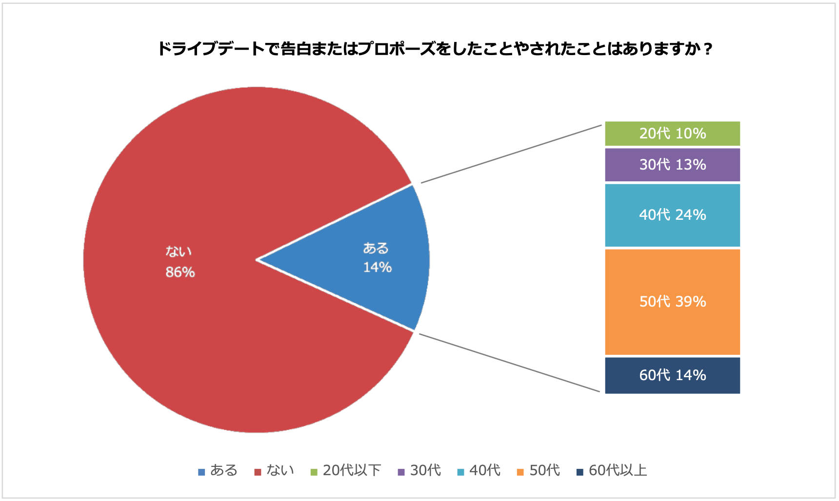ドライブデート中に、告白またはプロポーズをした・された経験がある人は、全体の14%でした。