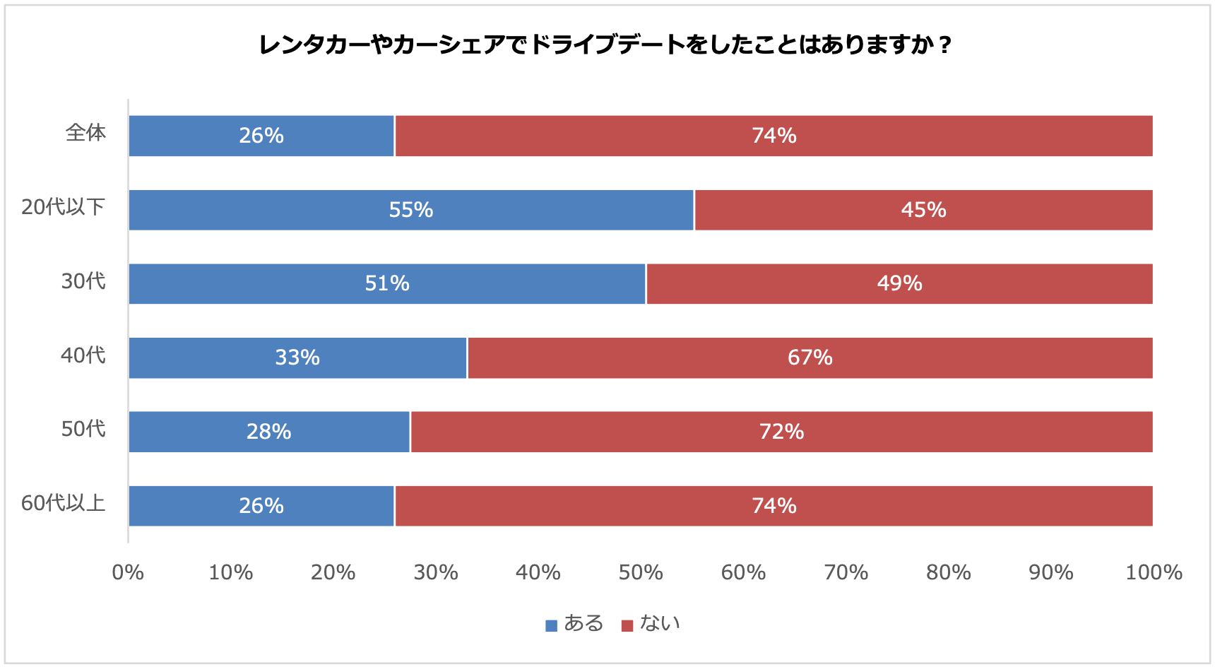 レンタカーやカーシェアでドライブデートをしたことが「ある」と回答した人は、26%でした。経験がある人の比率は若年層ほど高くなっており、30代以下は半数以上という結果になりました。一方で、40代以上は3割前後となり、年代による違いが見られました。