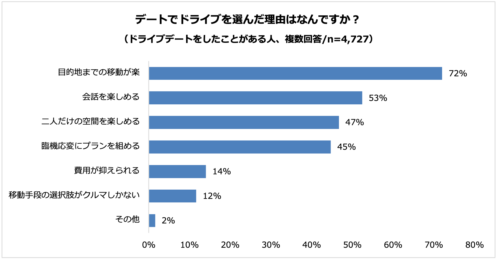 ドライブデートの経験がある人にドライブデートがいいと思う理由を尋ねたところ、「目的地までの移動が楽」72%が最も多く、次いで「会話を楽しめる」53%、「二人だけの空間を楽しめる」47%と続きました。