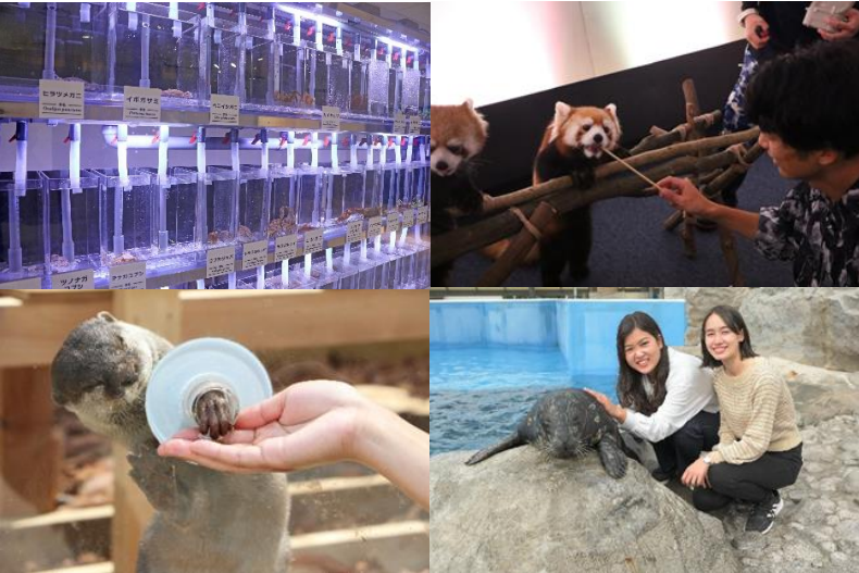 水族館「アクアミュージアム」では、コツメカワウソにごはんをあげて手のひらにタッチができる「コツメカワウソとあくしゅ」を実施しています。コツメカワウソの習性を生かして、手を伸ばして器用にごはんをつかむ仕草を間近で体験できます。