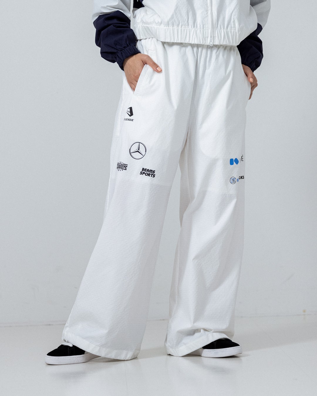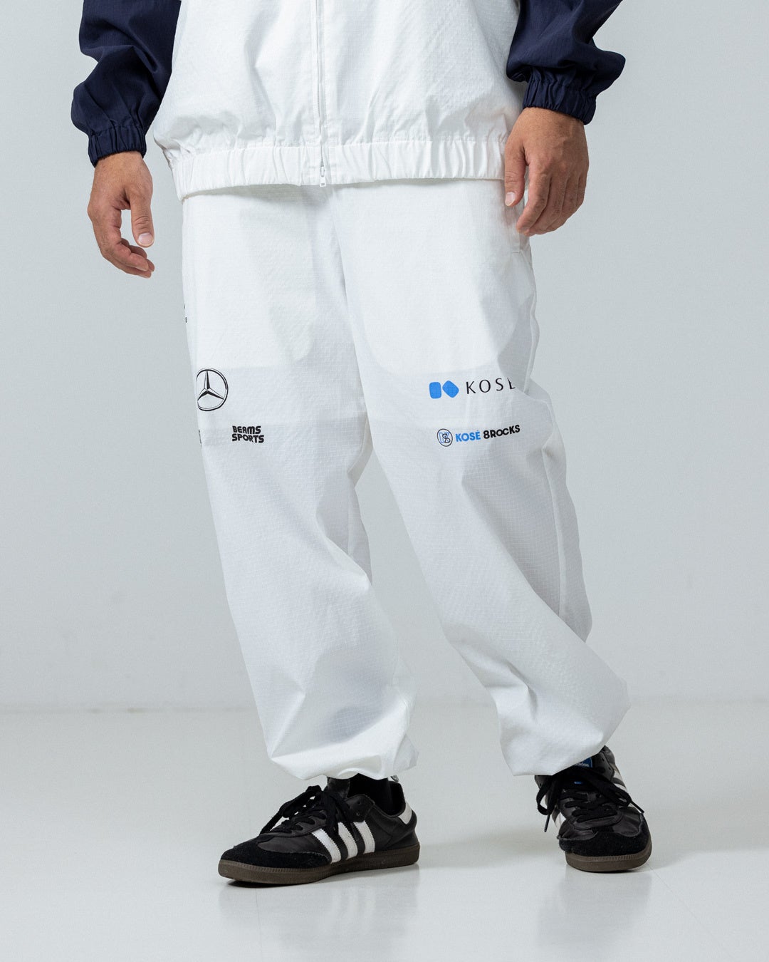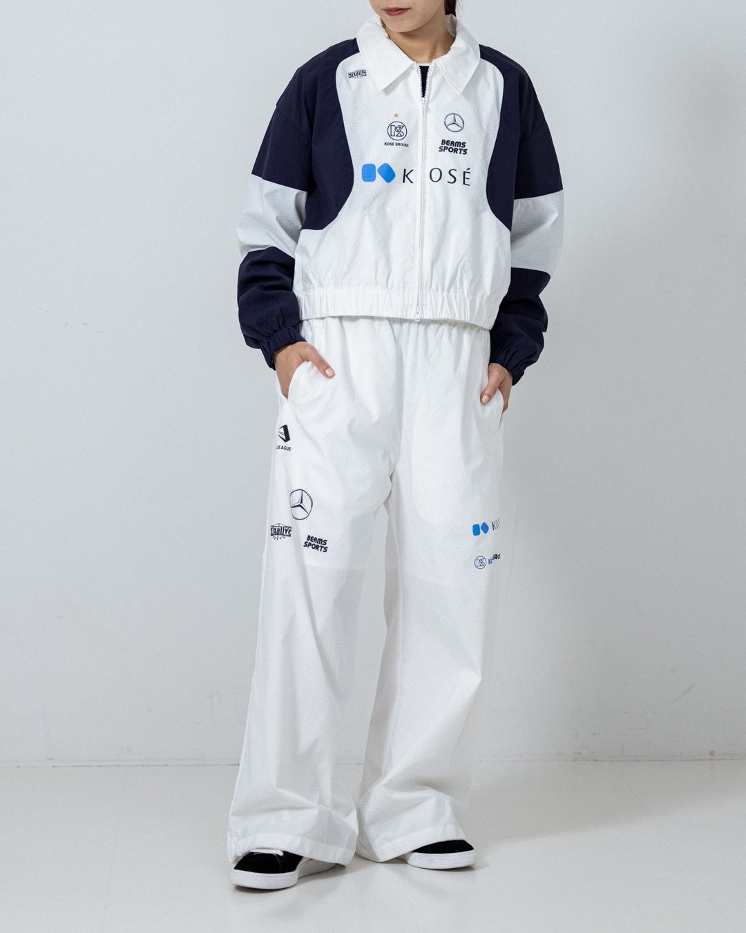 ステージに映えるホワイトカラーをベースに、ネイビーと掛け合わせた都会的で洗練されたイメージでデザインしました。ほつれや破れに強いドビーリップストップナイロンポリを採用し、ブレイキンのアクティブな動きにも対応する機能性も兼ね備えています。ダンスの動きがより際立つよう、袖のカラー配分や、パンツの太さなどの細部にもこだわり、ブレイキンのダイナミックなイメージの中にも、品をプラスするようなセットアップで、新たな表情を演出します。