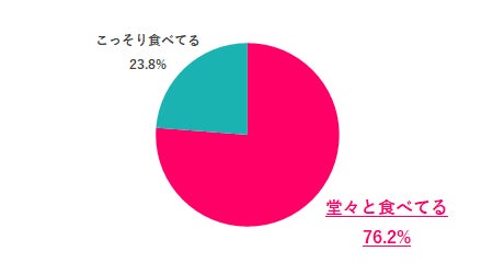 職場でお菓子を食べる際はどのように食べているかを聞くと、「堂々と食べてる」76.2%が圧倒的に多い結果となりました。Q.1の結果からも、「職場でお菓子を食べる」という行為は日常的なものであり、罪悪感や引け目を感じる人は少ないことがうかがえます。