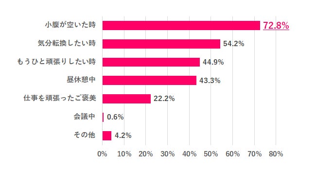 職場でお菓子を食べるタイミングを聞くと「小腹が空いた時」72.8%が最も多く、「気分転換したい時」54.2%、「もうひと頑張りしたい時」44.9%が続きました。