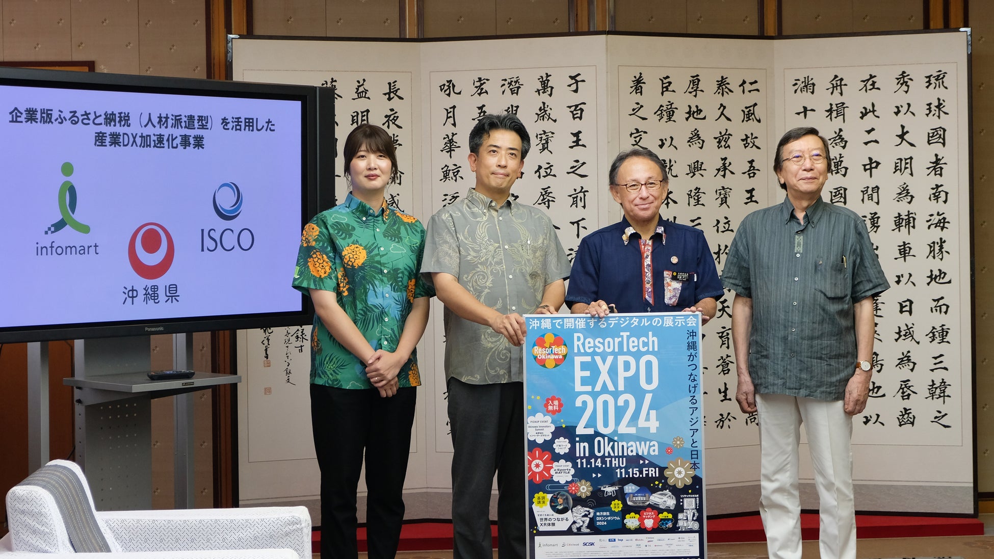 このような背景から、この度、沖縄県の全産業DX推進の支援をより一層強化することを目的に「リゾテックエキスポ2024」での活動において、企業版ふるさと納税(人材派遣型)の仕組みを活用し、沖縄県に寄附を行うとともにISCOに社員1名を派遣することを決定しました。これにより、沖縄のDXを前に進め、地域活性化に貢献してまいります。
