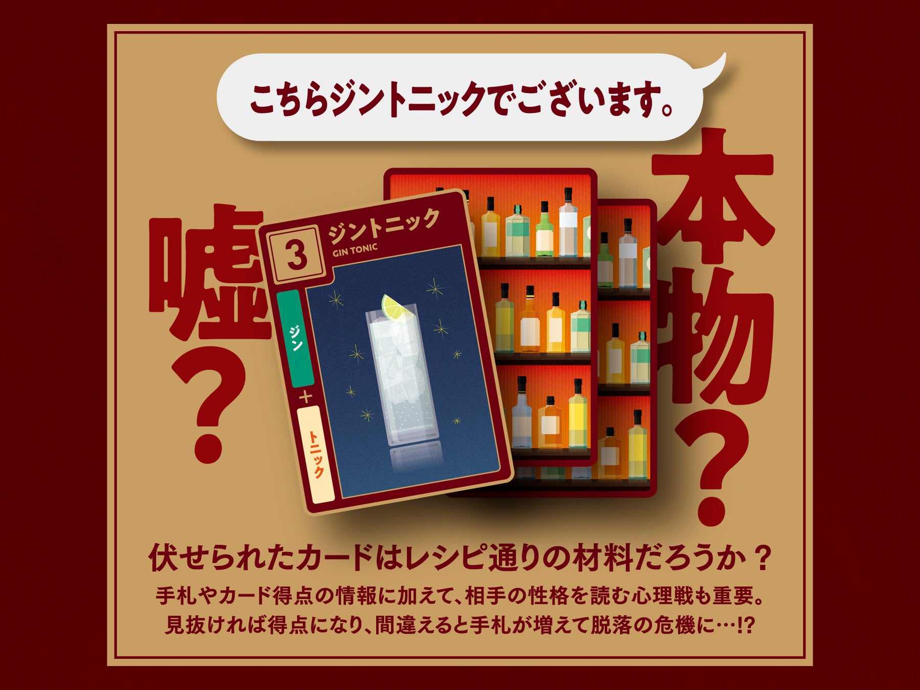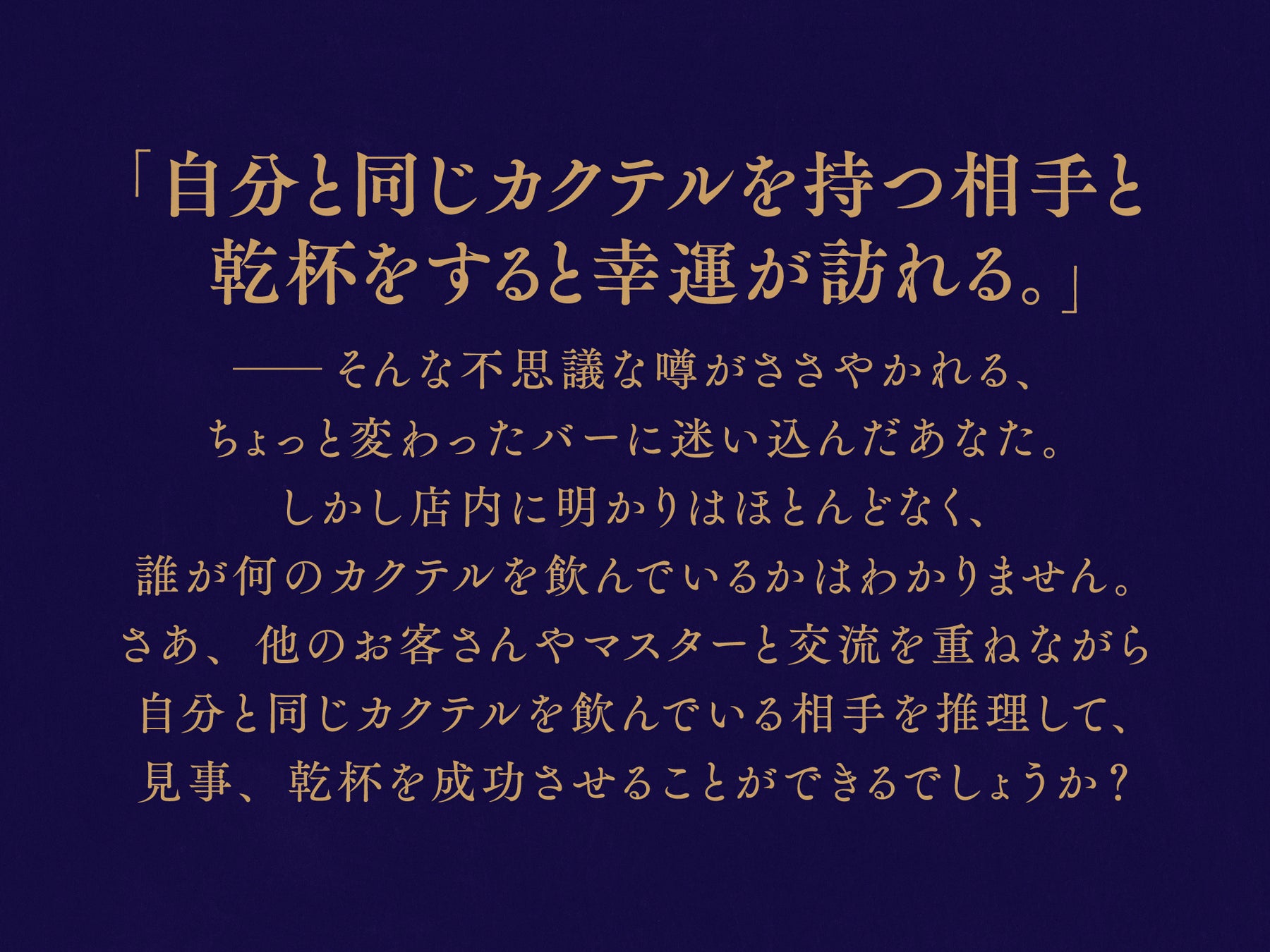 手札の見えない暗闇のBARで、自分と同じカクテルを持つ相手と乾杯を狙う「推理×戦略ゲーム」。