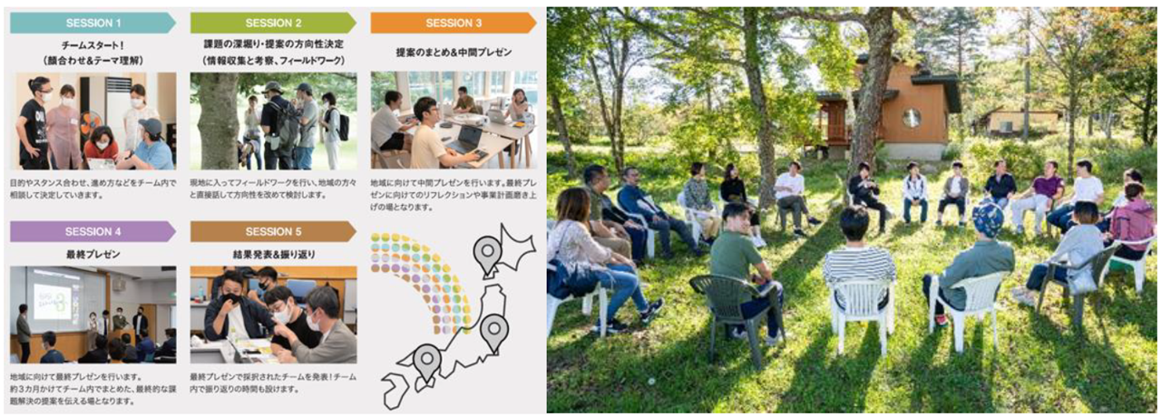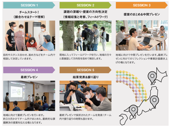 全国約40エリアで地方創生事業のプロデュースを行う株式会社さとゆめ(代表取締役:嶋田俊平、以下「さとゆめ」)と、日本最大級の異業種混合型リーダーシップ開発プロジェクトを提供する一般社団法人ALIVE(代表理事:庄司 弥寿彦、以下「ALIVE」)が共同事業として運営しています。3カ月の期間で実際に地域のフィールドワークを重ね、「チームビルディング⇒フィールドワーク⇒最終提案⇒振り返り」を行います。現業の立場や複業・プロボノ的にプロジェクトに緩やかに関わりながら、関係性を深めることを目的としています。