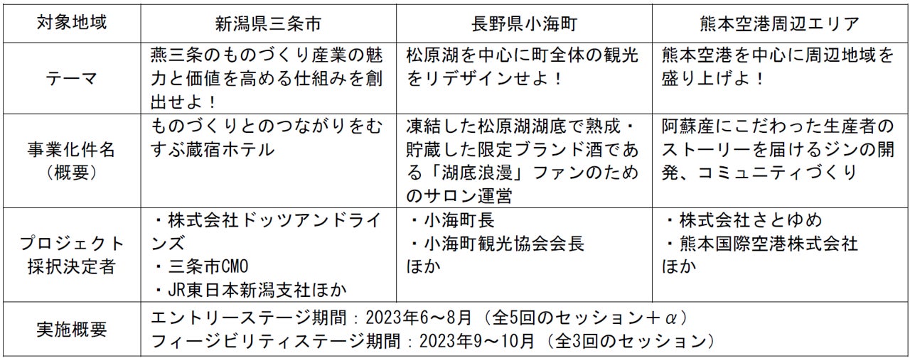 ○株式会社100DIVE(代表取締役CEO:庄司 弥寿彦、以下「100DIVE」)と東日本旅客鉄道株式会社(代表取締役社長:深澤 祐二、以下「JR東日本」)は、新潟県三条市、長野県小海町、熊本空港周辺エリアの3地域において、地域課題を解決する新たなビジネスを生み出すためのプロジェクト「100DIVE 4期」を2023年6月から開始しています。 ○このたび、3地域から各1件を事業化件名として採択しました。 ○JR東日本と共に事業化件名をサポートする東京海上日動火災保険株式会社は、「100DIVE4期」参加者のビジネス創出、事業化に向けての情報提供によるサポートを行います。 |