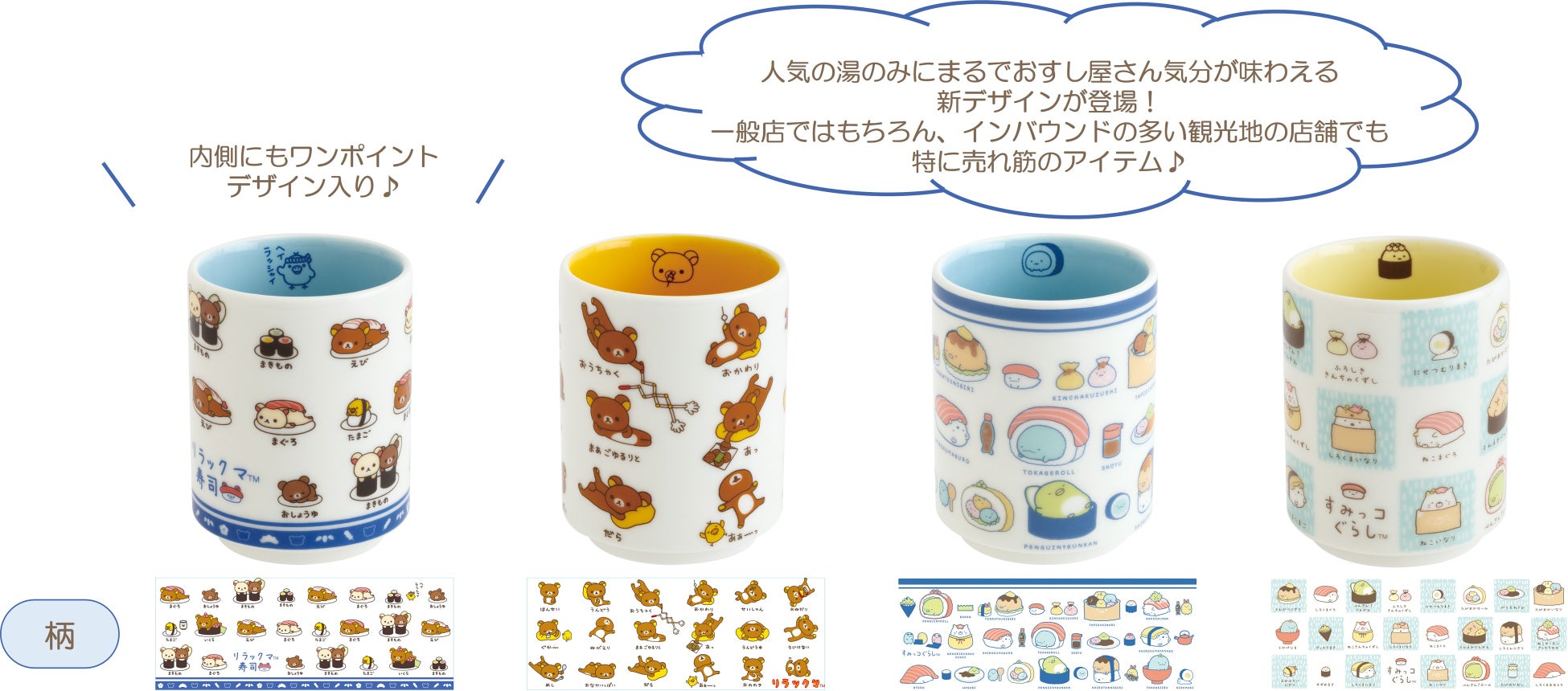 おすしを食べるときにぴったりなおすし皿や湯のみ、しょうゆさし、しょうゆ皿などの食器類から、キャラクターたちがおすしやおすし屋さんの大将になりきったかわいいぬいぐるみ、割りばしみたいなボールペンなどの商品が登場し、インバウンド需要にもぴったりなアイテムです。