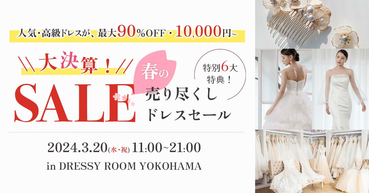 横浜駅直結、NEWomMan・JR横浜タワーの21階、PLACOLE&DRESSY(プラコレ&ドレシー)の“体験型”花嫁相談カウンター【DRESSY ROOM YOKOHAMA】にて、人気・高級ウェディングドレスの年に一度、最大90%OFFになるセールを実施することが決定いたしました。なんと人気のドレスが10,000円〜お買い求めいただけ、その日限りの特典やプレゼントもご用意。ウェディングドレスは200着以上、結婚式や特別な1日にお使いいただけるアクセサリーも200種類以上ご用意がございます。ウェディングドレスに関するお悩みやご不明点をその場でプロのアドバイザーに相談も可能。お直し専門スタッフも在籍しているので、サイズなどのお直しもお任せください。詳細記事:https://dressy.pla-cole.wedding/weddingdress-sale20240320/