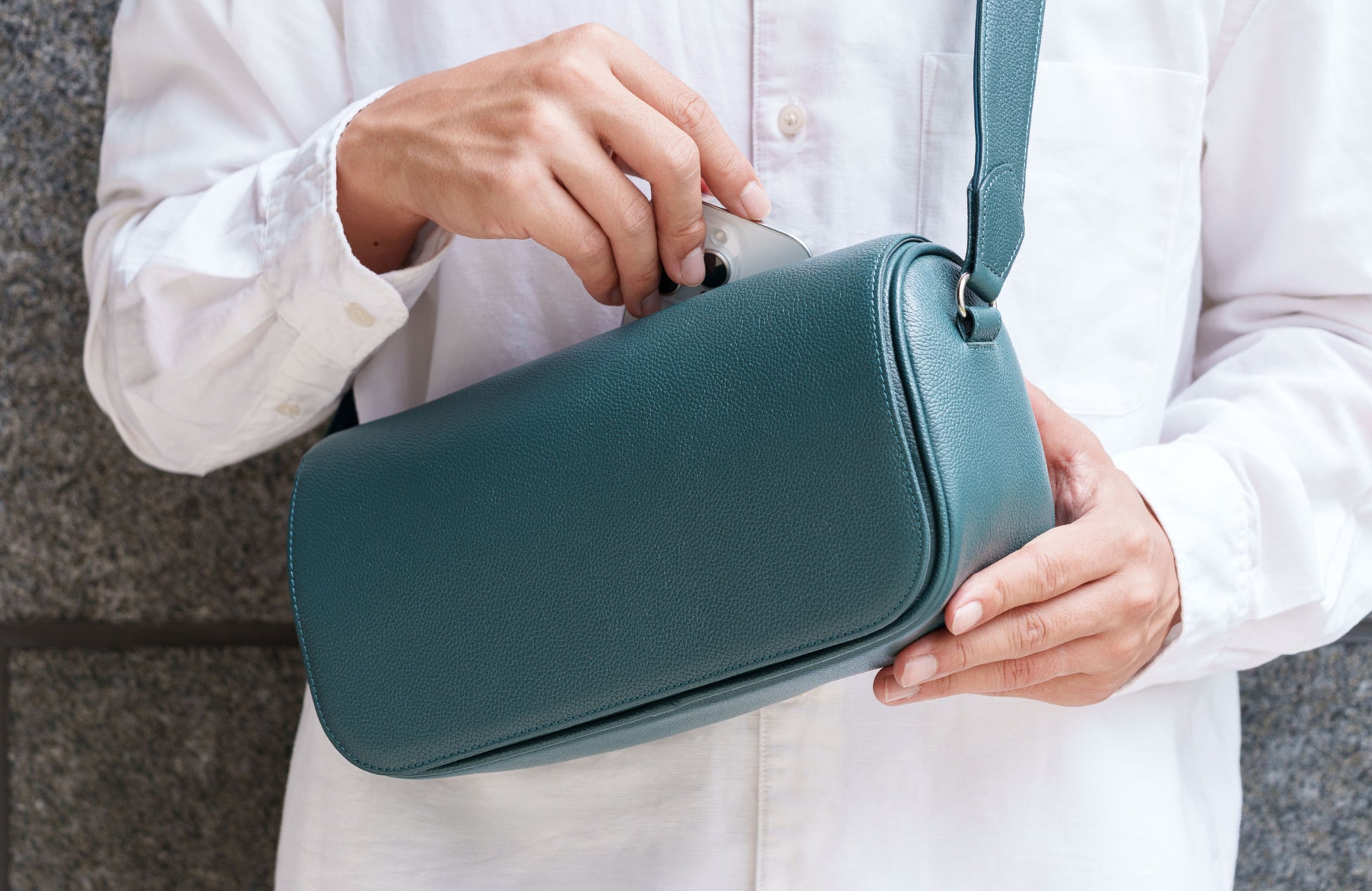 肩に掛けたまま片手で開けられるマグネット式フラップを採用し、外ポケットもマグネット仕様にすることで、出し入れのスムーズさとデザイン性を兼ね備えています。