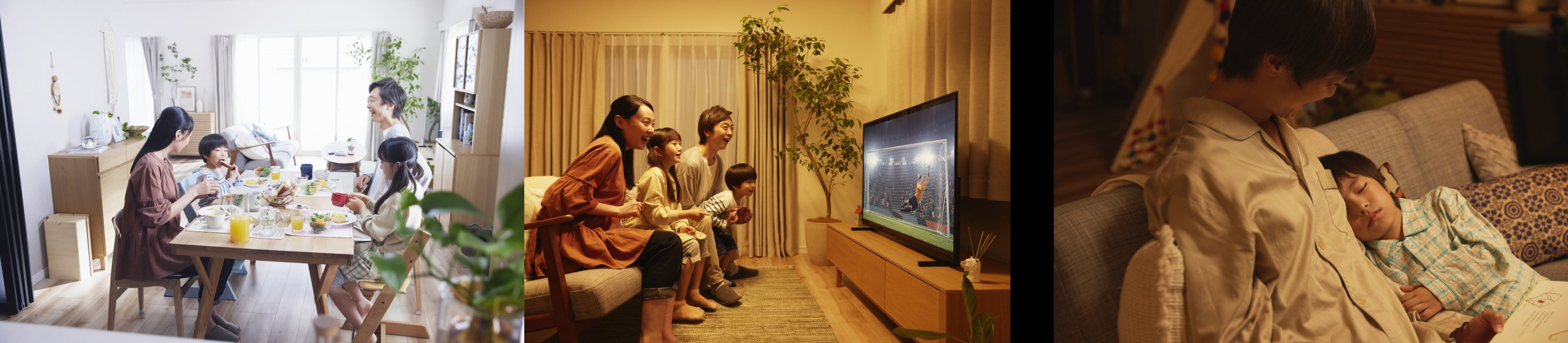 家族と過ごす団らんの時間も、ひとりで過ごす自由な時間も。ふだんの家事や在宅ワークに気分が乗らない時だって。天井から降り注ぐ光と音を組み合わせて、くらしのシーンをさまざまに演出。テレビとつないで、スマホで好きな音楽をかけて、気分を盛り上げることができます。