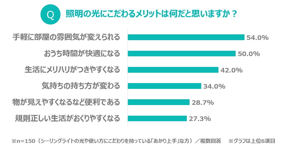 それでは、「あかり上手」たちは、なぜこれほど照明にこだわっているのでしょうか。「あかり上手」たちに、照明の光にこだわるメリットを聞いたところ、「手軽に部屋の雰囲気が変えられる」(54.0%)のほか、「おうち時間が快適になる」(50.0%)、「生活にメリハリがつきやすくなる」(42.0%)、「気持ちの持ち方が変わる」(34.0%)などの回答が上位になりました。あかりにこだわることは、くらしにポジティブな影響をもたらすと感じている人が多いようです。