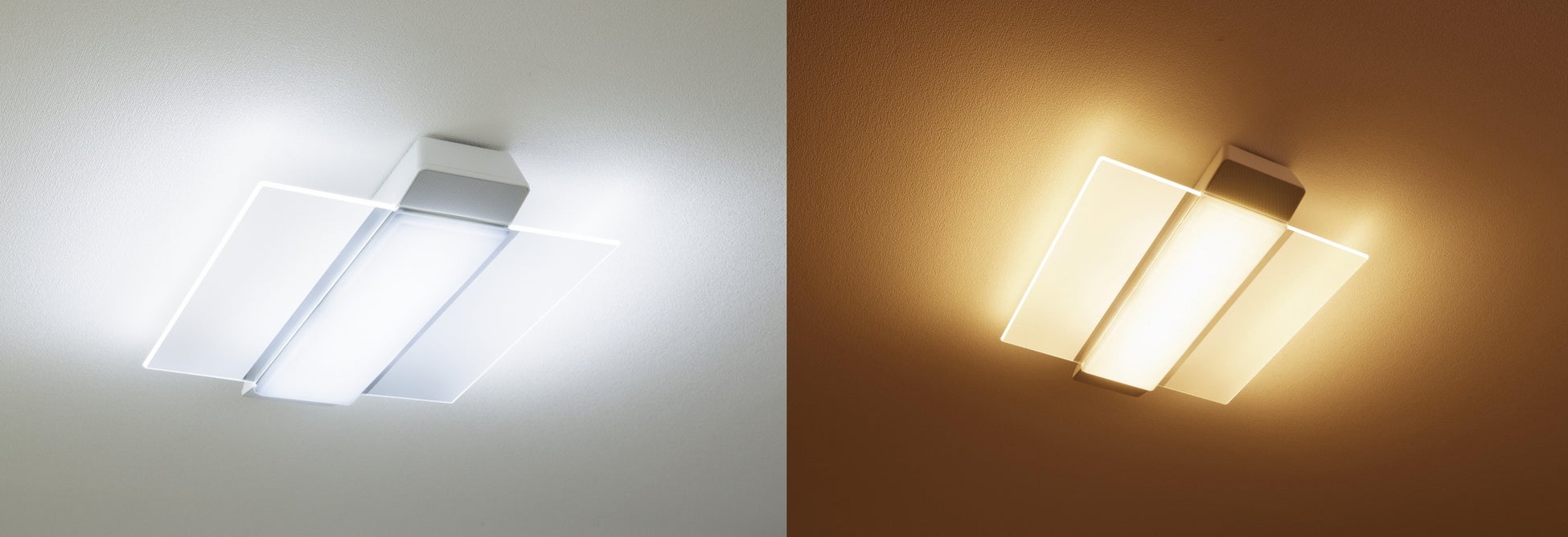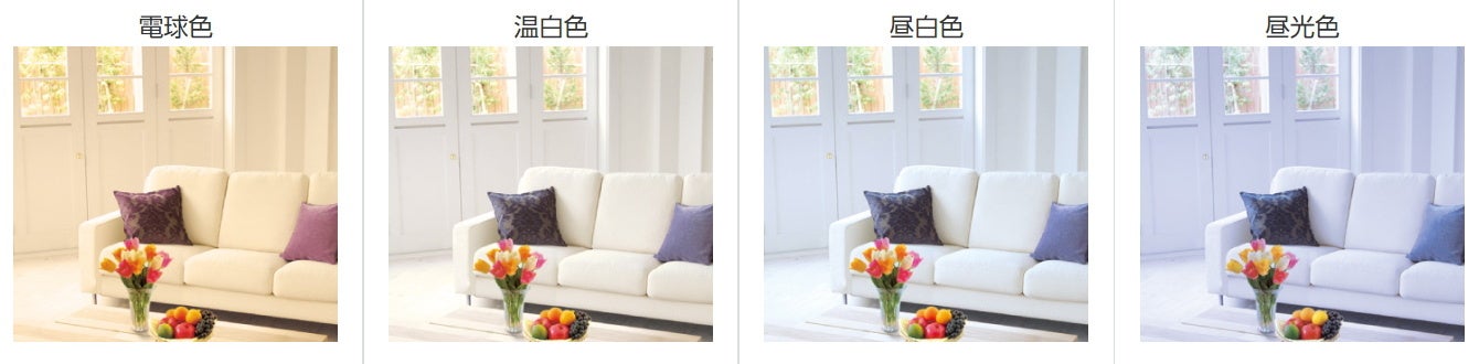 お部屋での過ごし方に合わせて、電球に似た温かみのある「電球色」、落ち着いた明るさの「温白色」、いきいきとして自然な「昼白色」、すがすがしいさわやかな「昼光色」と、4つの光色から選ぶことができます。