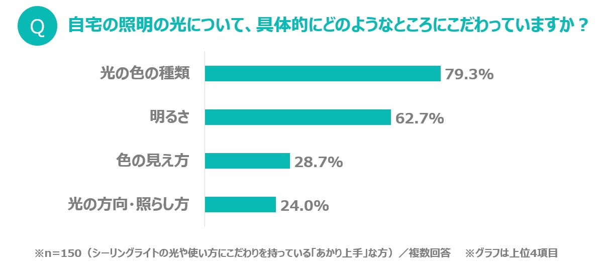 はじめに、シーリングライトの光にこだわりを持っている「あかり上手」な方(n=150)に、具体的にどのようなところにこだわっているかを質問したところ、「光の色の種類(白色と電球色との使い分けなど)」(79.3%)、「明るさ(時間帯やシーンによって明るさを調節するなど)」(62.7%)が特に多い結果となりました。また、「色の見え方(自然光と同じような色にみえるよう演色性の高いものを選ぶなど)」(28.7%)、「光の方向・照らし方(タスクライト(※1)とアンビエントライト(※2)の使い分けなど)」(24.0%)と回答した人も、それぞれ2割以上にのぼっています。「あかり上手」たちは、光の色、明るさ、見え方、照らし方など、さまざまな部分にこだわりを持っているようです。