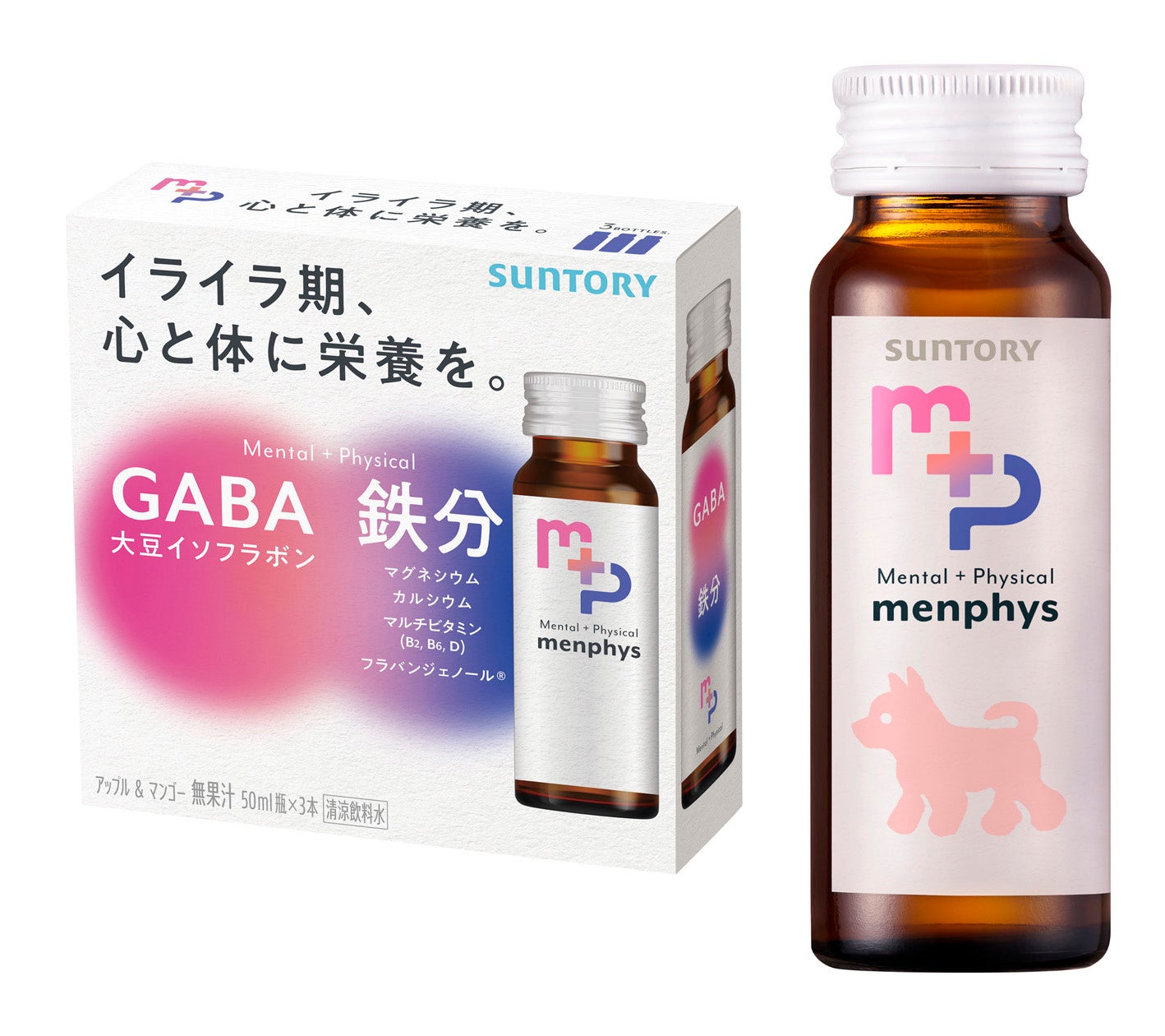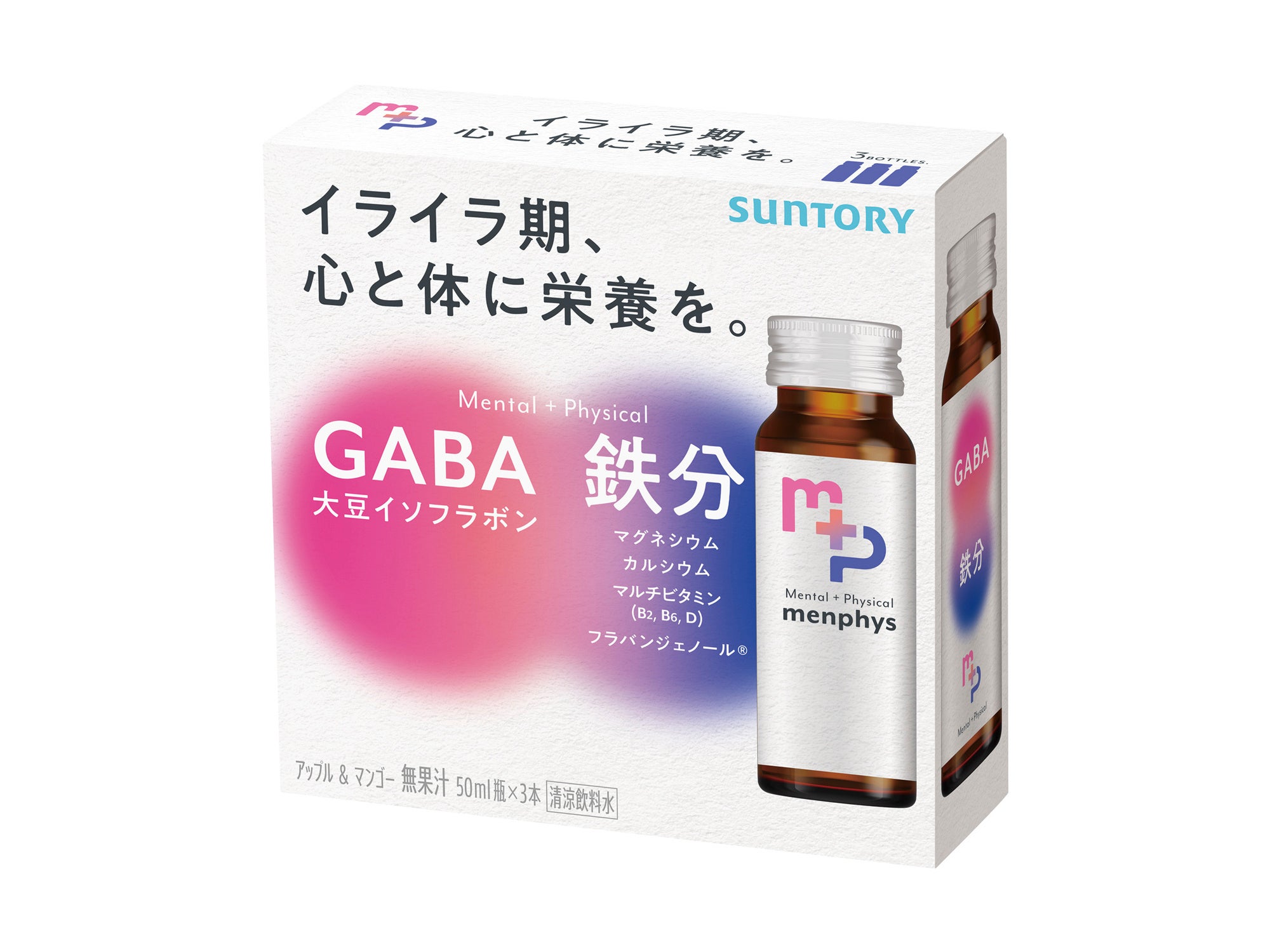 「menphys GABA&アルギニン&亜鉛」は、男性としての自信を取り戻したいという悩みに着目したドリンクです。また、「同 GABA&大豆イソフラボン&鉄分」は、女性特有のイライラ期を明るく前向きに変えるサポートをします。