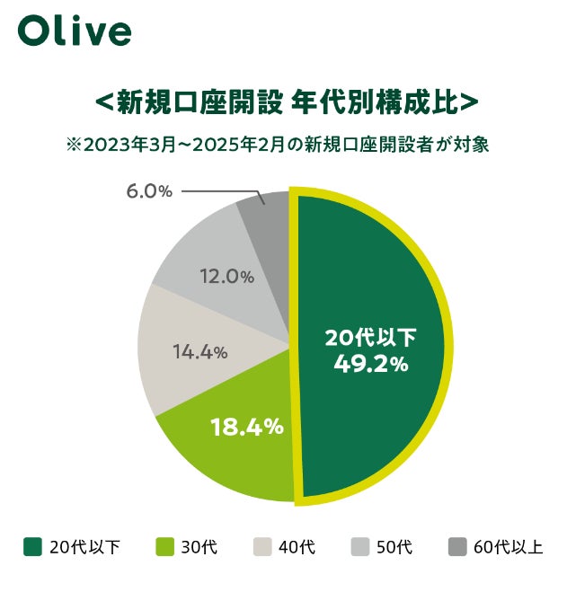 Oliveのサービス開始以降、新規で口座開設されたお客さまは、約半数が20代以下の方です。また、新規口座開設数を年代別にみて、Olive提供開始以前と同期間の開設数を比べると、特に40代では211%、50代では222%と顕著に伸びており、幅広い年代のお客さまからお申し込みいただいています。