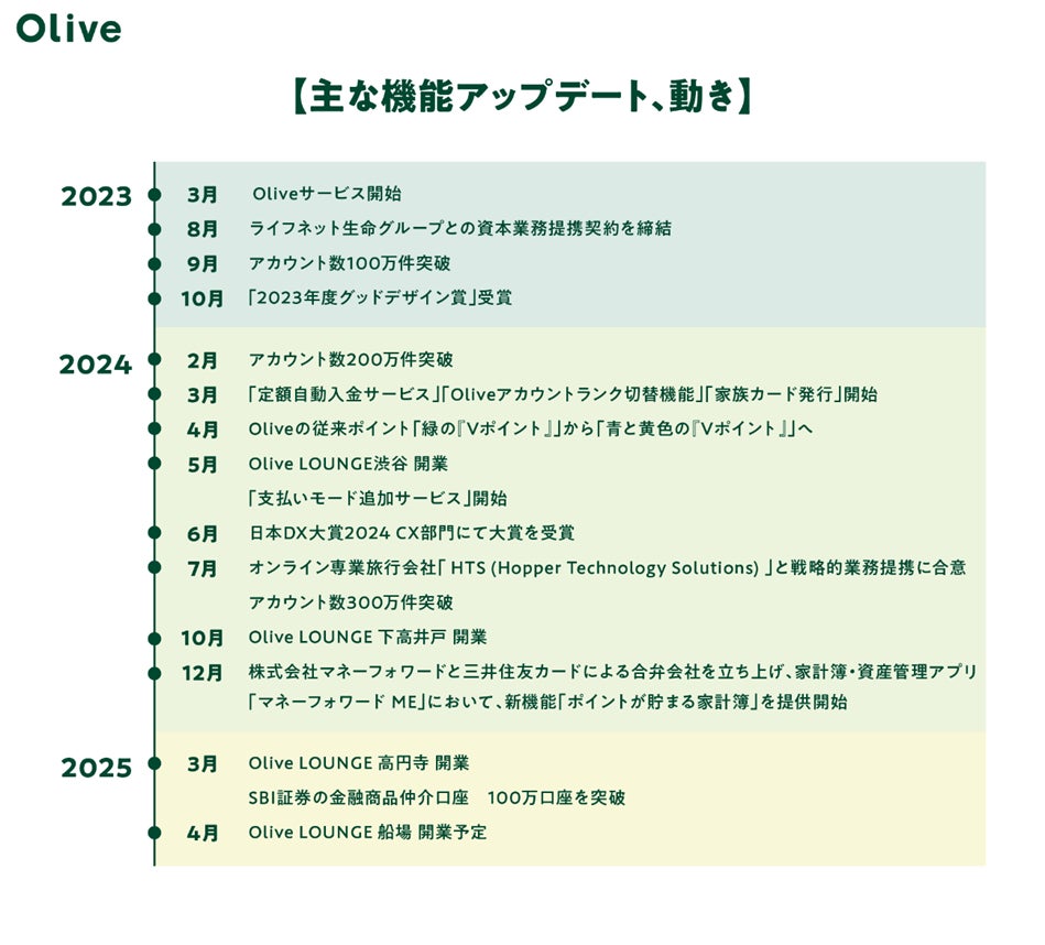 サービスを開始してから2年間、SMBCグループの枠を超えた、各業界のトッププレイヤーとの業務提携のほか、機能面では他行口座からOliveアカウントへ自動入金できる「定額自動入金サービス」や、お手持ちのクレジットカードを最大5枚まで追加できる「支払いモード追加サービス」など、継続的なアップデートを重ねてまいりました。