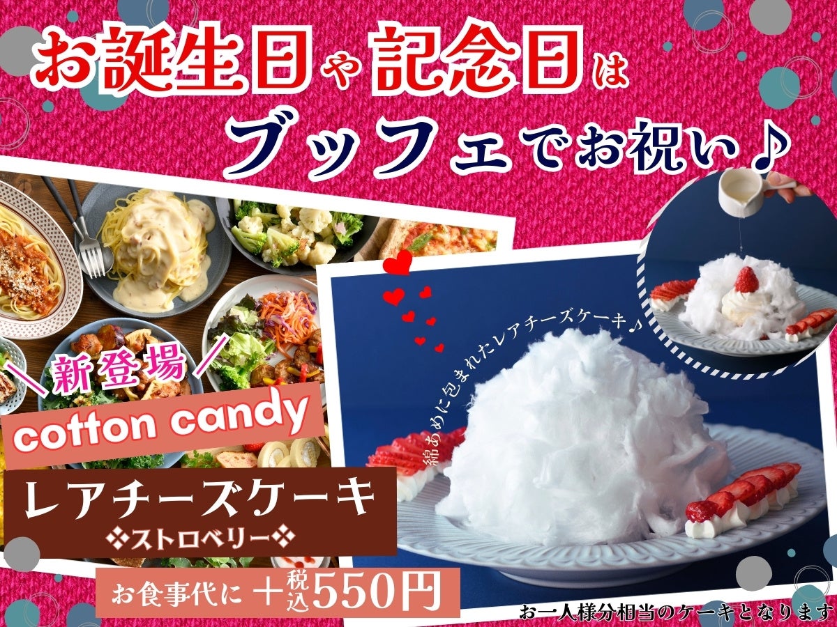 【食べ放題で特別な日をお祝い♪】バラエティー豊かな食べ放題「ニラックスブッフェ」2店舗にて『楽しい♪美味しい♪』ムービージェニックなサプライズケーキ『コットンキャンディー レアチーズケーキ』が新登場!