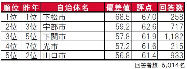 昨年に引き続き中部エリア(下松市・山口市・周南市・防府市)と西部エリア(宇部市・下関市・山陽小野田市)の自治体が上位を占めています。