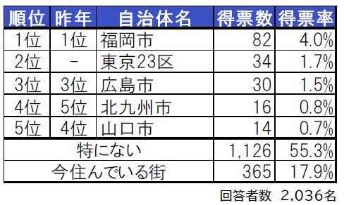 1位は2年連続で福岡市です。昨年は中国エリア・福岡県の自治体のみを対象として集計していましたが、今年は全国の自治体を対象とした結果、2位は東京23区です。3位は、2年連続で広島市となっています。