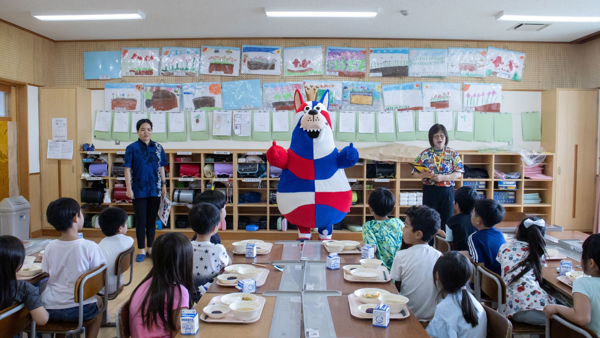 沖縄県内での提供に先がけて、5月8日(水)にホームタウン沖縄市内の小中学校の給食献立に登場しました。また、沖縄市立越来小学校へマスコットのゴーディーが訪問し、2年生のクラスに「キングスデザイン海苔」を配膳いたしました。