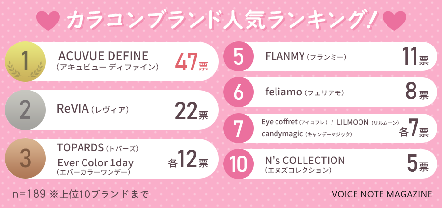 事前調査で「カラコンを使用している」と回答したボイスノート会員189名を対象に、「カラコンブランドに関するアンケート」を実施しました。
