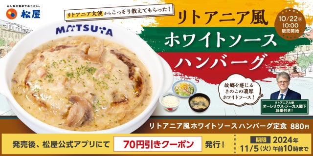 きのこがたくさん採れることで有名なリトアニアとコラボし、「リトアニア風ホワイトソースハンバーグ」を販売いたします。本商品はリトアニア大使からのXを通した1通のメッセージをきっかけに、大使館との共同企画開発がスタート。開発において、何種類かのソースを試作する中でジーカス閣下も実食、アドバイスをいただきテスト販売に至りました。多くのご好評のお声をいただき今回全国販売いたします。「リトアニア風ホワイトソースハンバーグ」は、鉄板でふっくら焼き上げた松屋自慢のハンバーグに、マッシュルームの香りとベーコンの旨味がつまった濃厚でクリーミーなリトアニアオリジナルのホワイトソースをたっぷりかけた逸品で、リトアニア大使お墨付きの逸品。秋の味覚をお楽しみいただけます。この機会にぜひ、ご賞味ください。