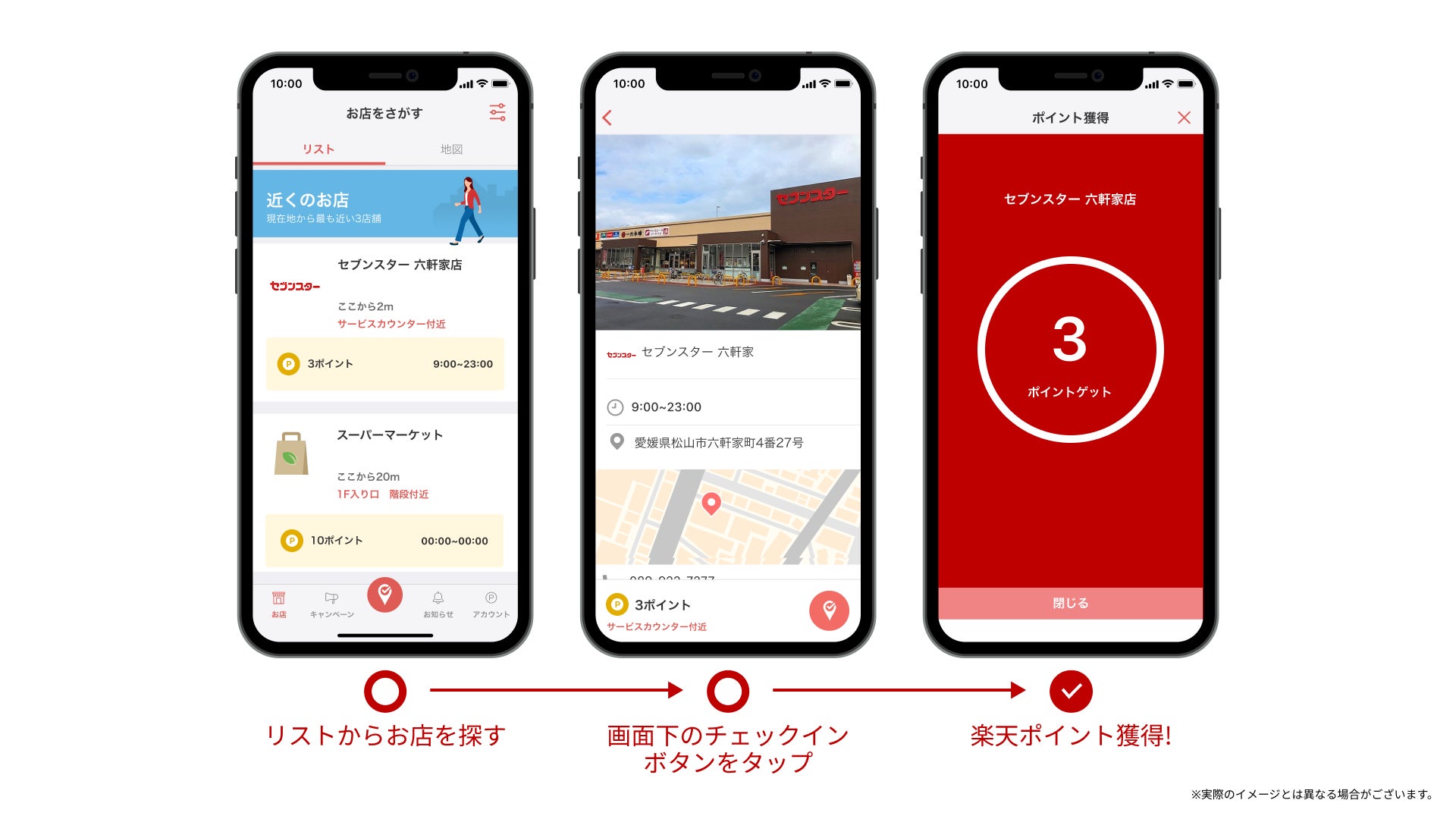 本導入により、利用者は店内の指定エリアで「楽天チェック」アプリを起動し、チェックインをすると、1回につき「楽天ポイント」を3ポイント獲得することができます(注1)。