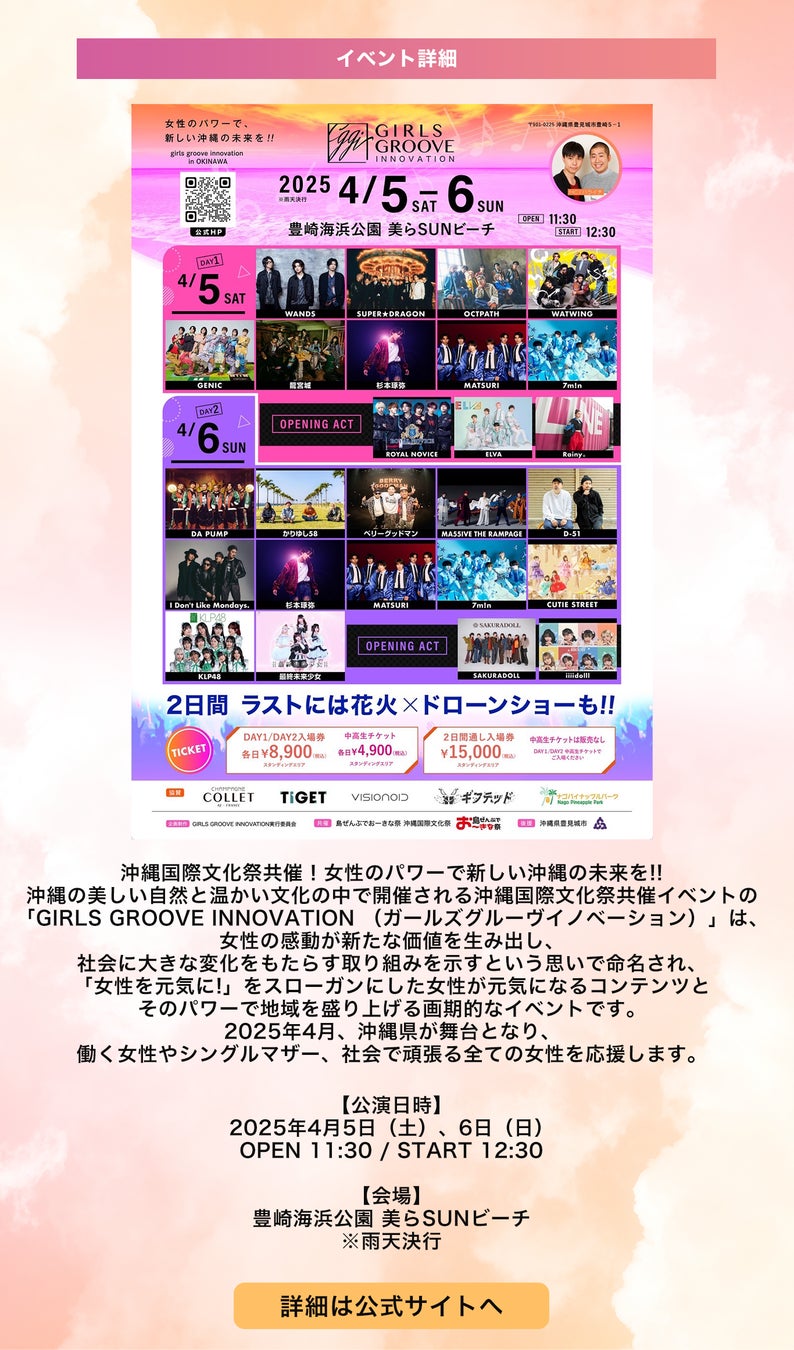 沖縄国際文化祭共催!女性のパワーで新しい沖縄の未来を!!沖縄の美しい自然と温かい文化の中で開催される沖縄国際文化祭共催イベントの「GIRLS GROOVE INNOVATION (ガールズグルーヴイノベーション)」は、女性の感動が新たな価値を生み出し、社会に大きな変化をもたらす取り組みを示すという思いで命名され、「女性を元気に!」をスローガンにした女性が元気になるコンテンツとそのパワーで地域を盛り上げる画期的なイベントです。2025年4月、沖縄県が舞台となり、働く女性やシングルマザー、社会で頑張る全ての女性を応援します。