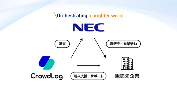 販売代理店契約とは、メーカーが提供するサービスを販売代理店が顧客に対して販売する方式での契約を指します。今回、クラウドワークスの自社開発プロダクトであるクラウドログをNECが販売いたします。また、導入支援のサポートについては、クラウドログが導入企業に対して直接行うというスキームでの取り組みを開始します。