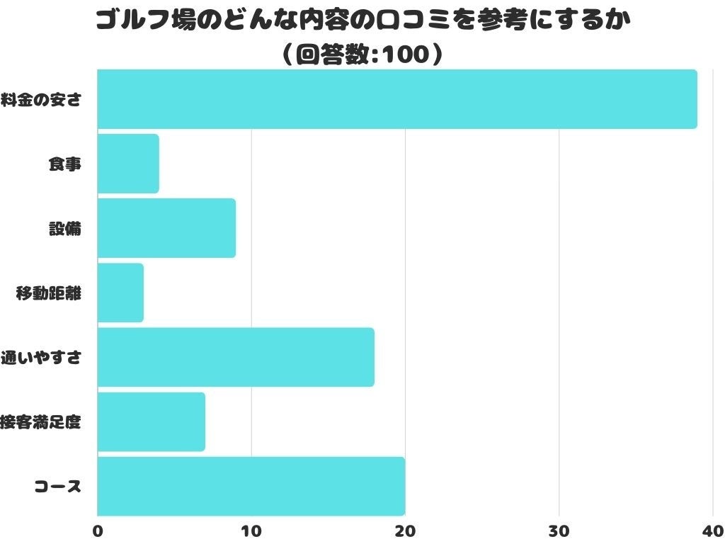 ゴルフ場のどんな内容の口コミを参考にするかをアンケートにて調査したところ、1位は「料金の安さ」でした。