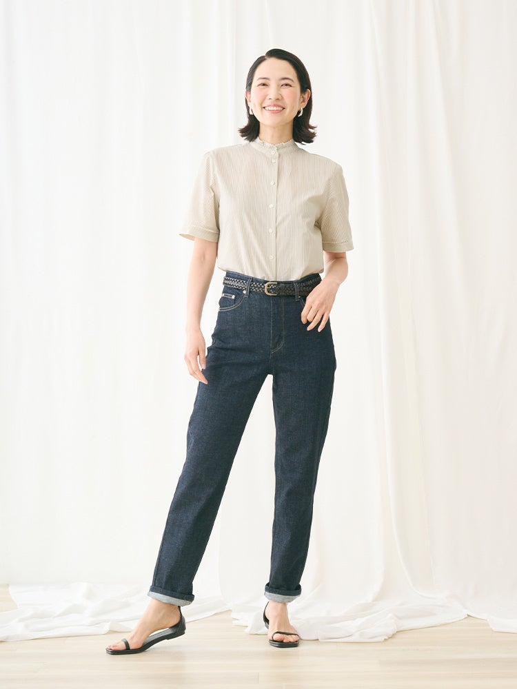 体のラインを拾い過ぎず、襟や袖口のディテールが可憐な印象を引き立てます。