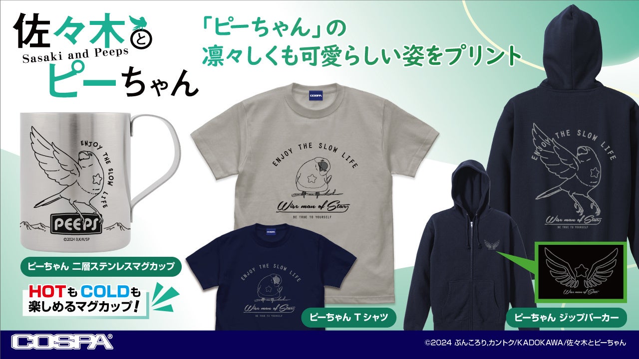 「佐々木とピーちゃん」より、「ピーちゃん」の凛々しくも可愛らしい姿のTシャツ、ジップパーカー、二層ステンレスマグカップがCOSPA(コスパ)から登場。
