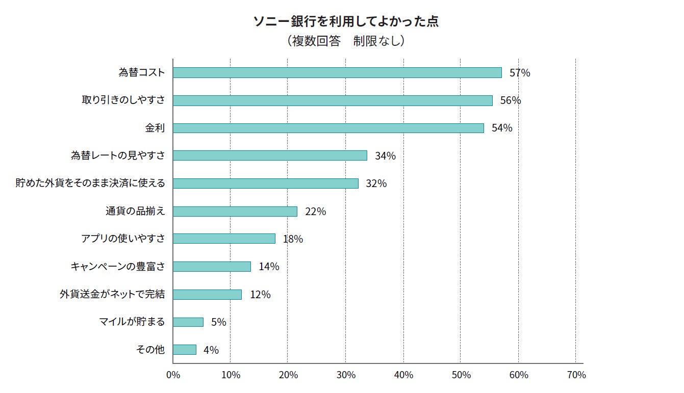 ソニー銀行を利用してよかった点は、「為替コスト」「取り引きのしやすさ」「金利」の順に回答が多く、いずれも50%以上となりました。貯めた外貨を海外でそのまま使える Sony Bank WALLET の利便性や為替レートの見やすさなど、実用性も評価いただきました。
