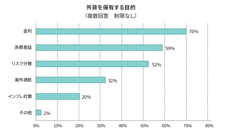 外貨預金の保有目的として70%のかたが「金利」と回答。また、「為替差益」、「リスク分散」を目的としているかたが50%以上に。貯めた外貨を外貨のまま使用するための「海外渡航」と回答したかたは32%。