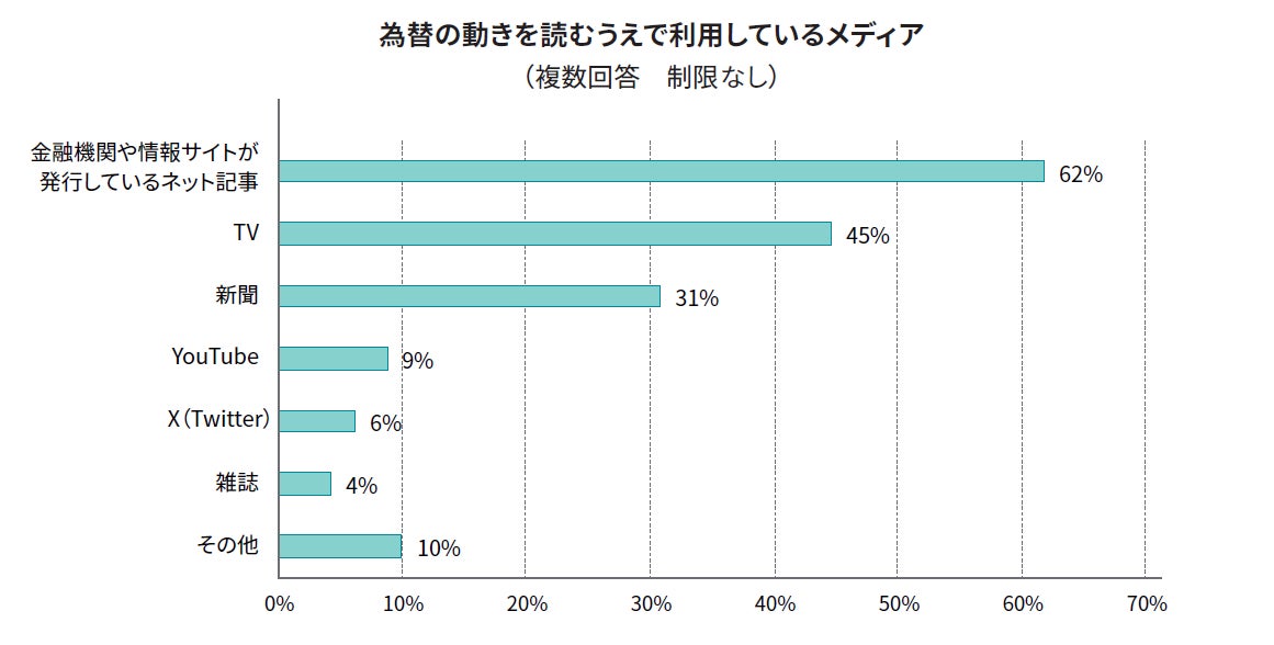 為替を読むうえで利用しているメディアは、「金融機関や情報サイトが発行しているネット記事」が最も多く62%に。為替の動きをチェックする頻度は、約半数が「毎日」と回答。