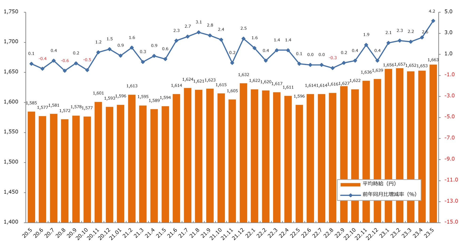 2023年5月度の三大都市圏平均時給は1,663円(前月比+10円・0.6%増、前年同月比+67円・4.2%増)。前月、前年同月ともに上回る結果になりました。平均時給の上昇には、デジタル化、DXの浸透が影響しています。