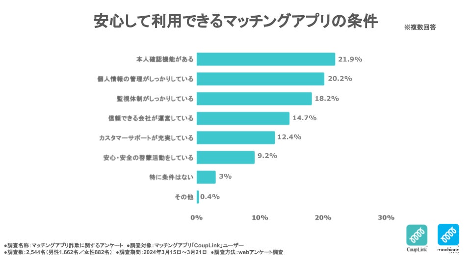 マッチングアプリユーザーに「安心して利用できるマッチングアプリの条件」を聞いたところ、1位「本人確認機能がある(21.9%)」、2位「個人情報の管理がしっかりしている(20.2%)」、3位「監視体制がしっかりしている(18.2%)」という結果になりました。