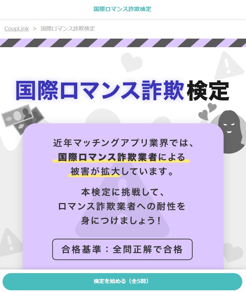 国際ロマンス詐欺検定:https://couplink.jp/certifications/romance_scam