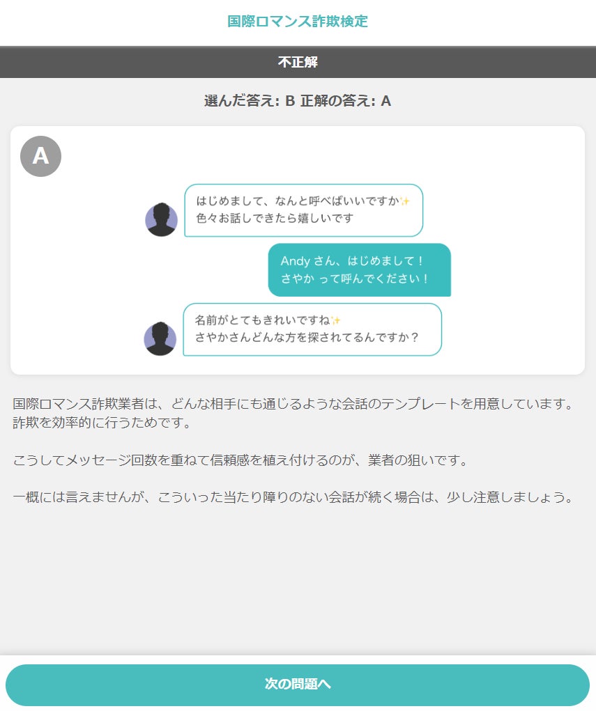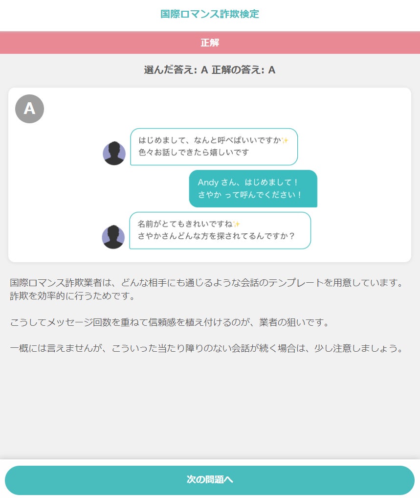 会員登録の必要はなく数分で終わるので、ぜひお試しください。メッセージ傾向などから、詐欺師を見分けるポイントを学ぶことができます。