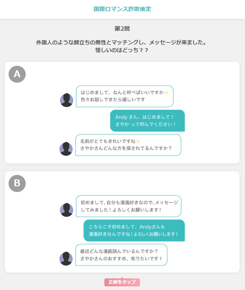 「CoupLink」では、詐欺の被害に遭わないための知識を学べる「国際ロマンス詐欺検定」を提供しています。検定は疑似的にマッチングした複数のユーザーとコミュニケーションをしながら、怪しいユーザーを見分けるチュートリアル形式で提供しています。