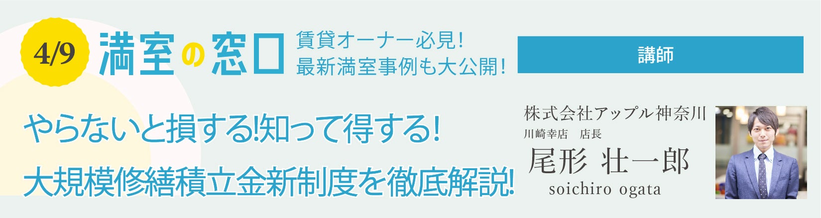 2022年3月12日(土)に開催した「苦戦物件が劇的に満室に!全国の満室事例大公開スペシャル!」では、最新の賃貸経営情報を実際の空室改善事例を交えて解説いたしました。2022年4月9日(土)のセミナーでは、株式会社アップル神奈川 川崎幸店 店長 尾形 壮一郎氏を講師にセミナーを開催します。当日は、「やらないと差がつく!知って得する!大規模修繕積立金新制度を徹底解説!」と題して、最新の賃貸経営動向などをふまえた満室経営実現のヒントなどを全国の満室成功事例を交えて詳しく解説します。※Webセミナーのため、スマートフォン、パソコンなどのタブレットとネット環境があれば、どこからでも参加可能です。