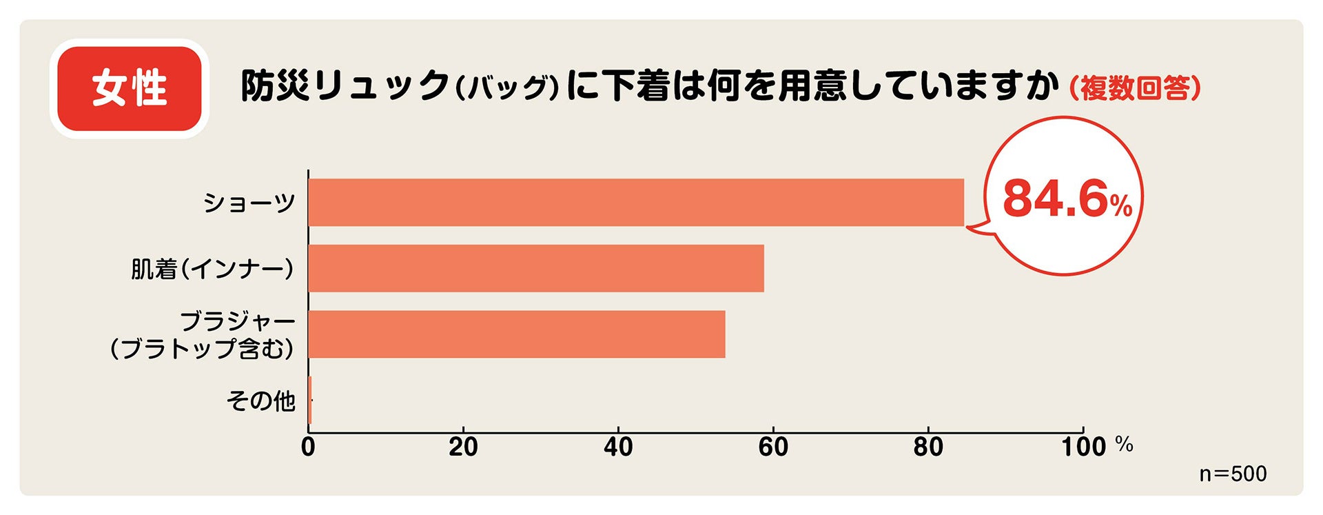 防災リュックに下着を入れている女性に、「防災リュック(バッグ)に下着は何を用意していますか?」(複数回答可)と質問すると、「ショーツ(84.6%)」「肌着(58.8%)」「ブラジャー(ブラトップ、カップ付きインナーも含む)(53.8%)」という結果になりました。