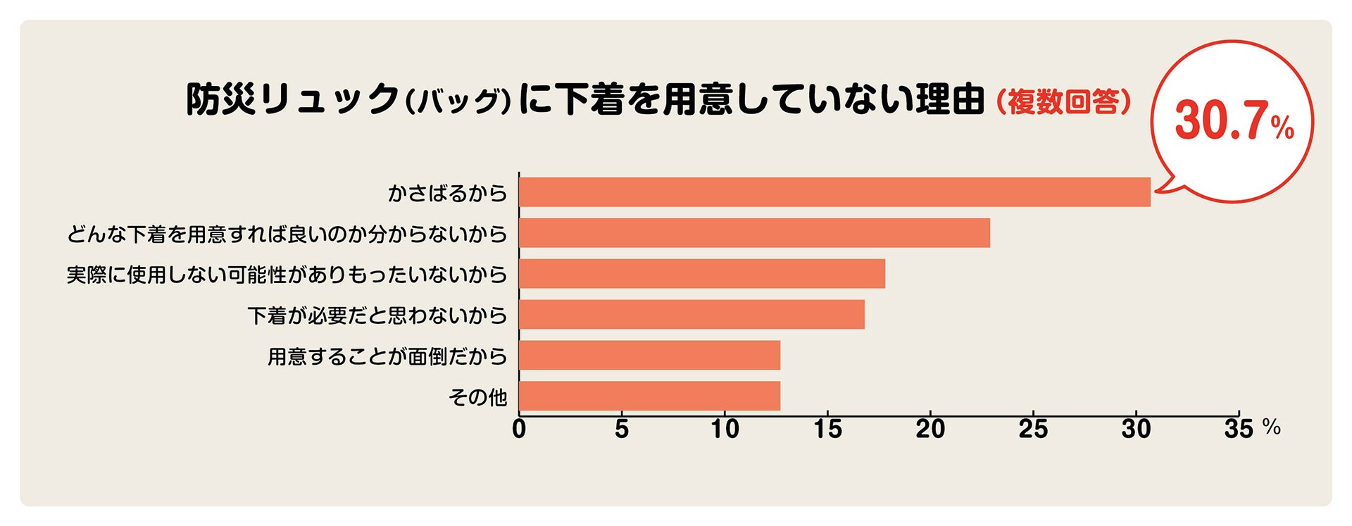 防災リュック(バッグ)に下着を用意していない理由を質問すると、「かさばるから(30.7%)」「どんな下着を用意すれば良いか分からないから(22.9%)」「実際に使用しない可能性がありもったいないから(17.8%)」と、持ち出し用の防災リュックは収納スペースに限界があり、多くのアイテムを入れる必要があるため、「かさばるから」が下着を準備していない理由のトップとなりました。