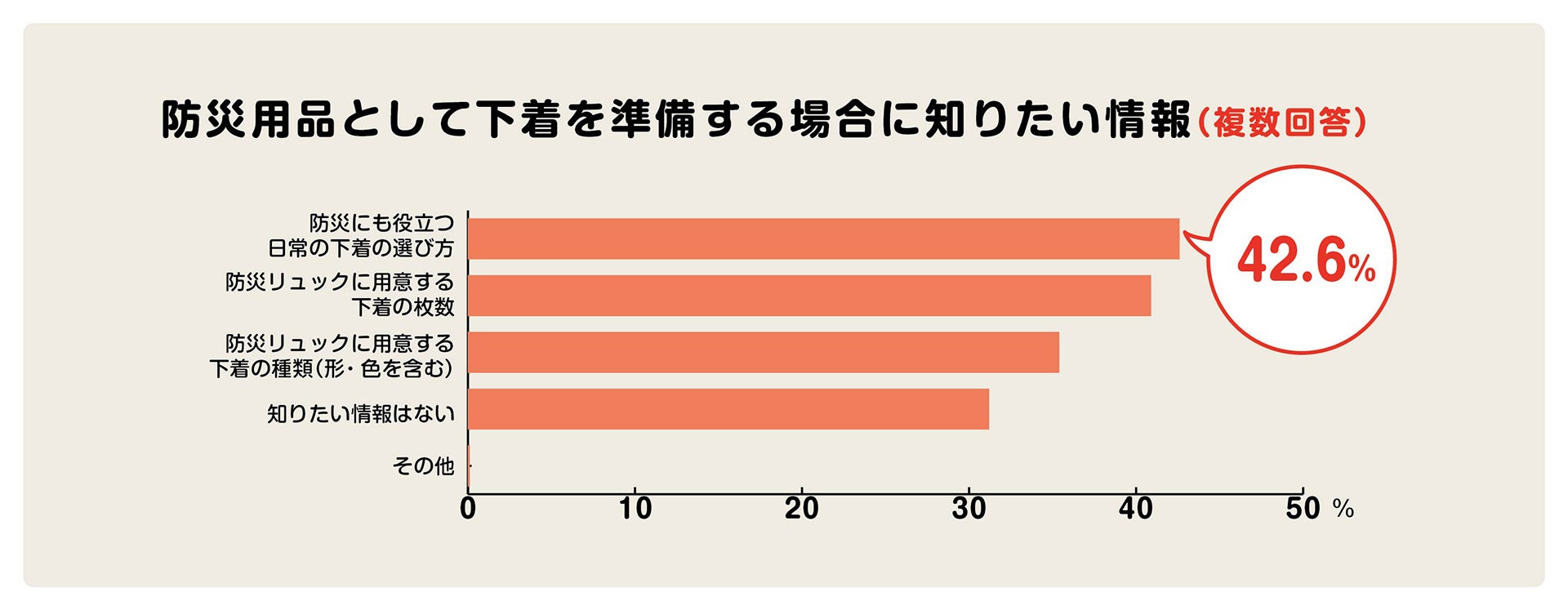 「防災に役立つ下着に関して知りたいこと」(複数回答可)を尋ねたところ、「防災にも役立つ日常の下着の選び方(42.6%)」が最も知りたいこととして挙げられました。次いで「防災リュック(バッグ)に用意する下着の枚数(40.9%)」「防災リュック(バッグ)に用意する下着の種類(形・色を含む)(35.4%)」と続きました。