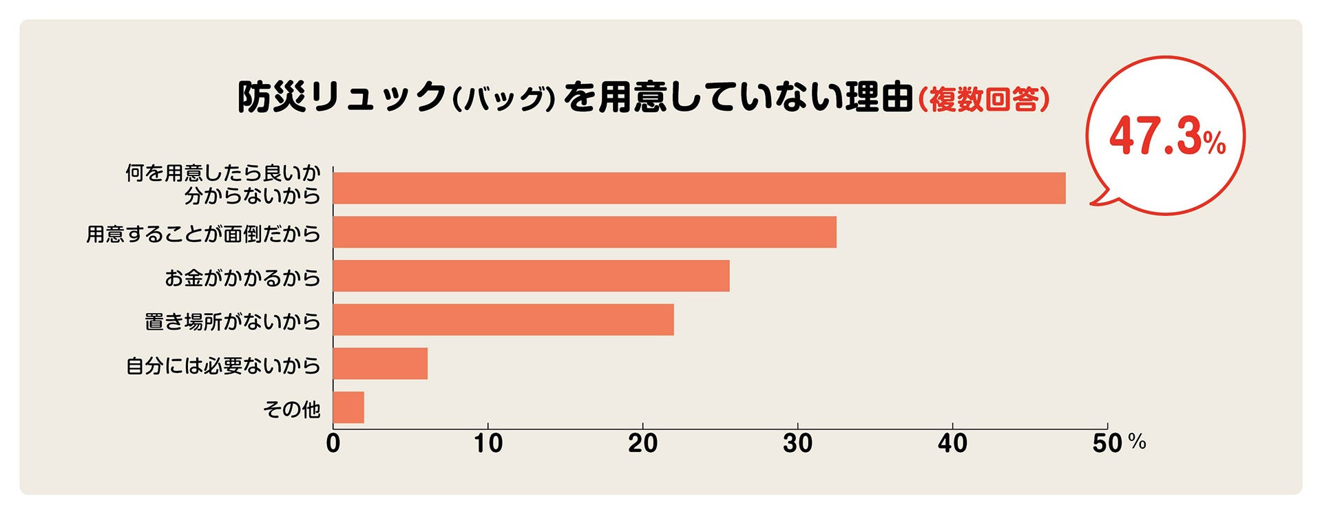 防災リュック(バッグ)を用意していない理由(複数回答)は、「何を用意したら良いか分からないから(47.3%)」がトップ。次いで「用意することが面倒だから(32.5%)」という結果になりました。