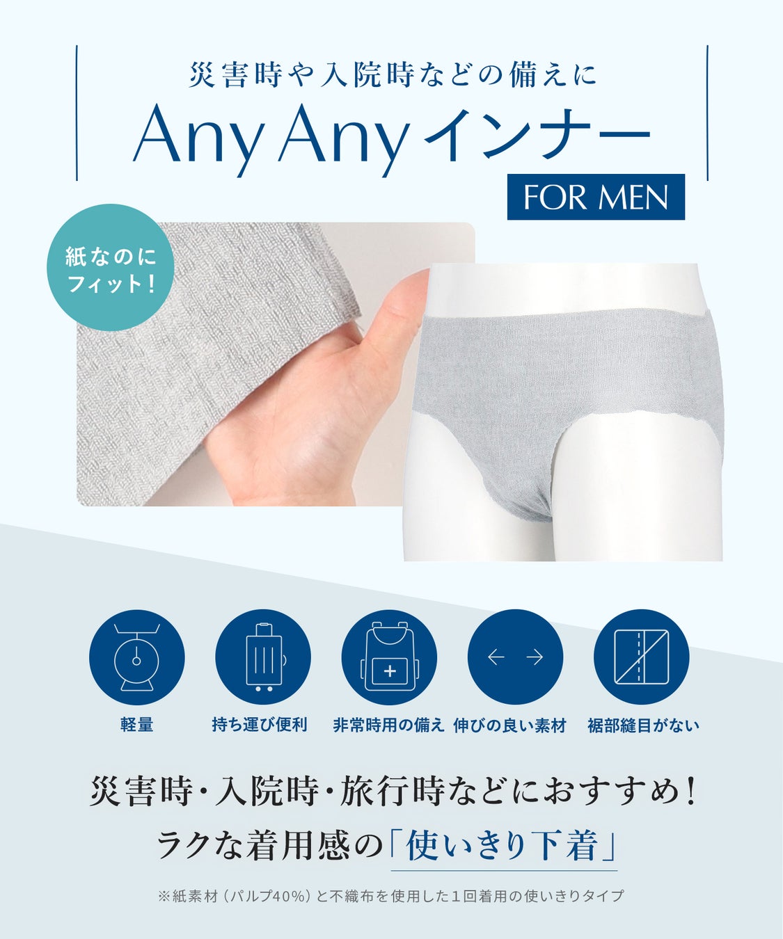 災害時や入院時などで使用可能なラクな着用感の使いきり下着。紙素材(パルプ40%)と不織布を使用し、横方向に伸びてやさしくフィット。軽量のパッケージで持ち運びに便利。