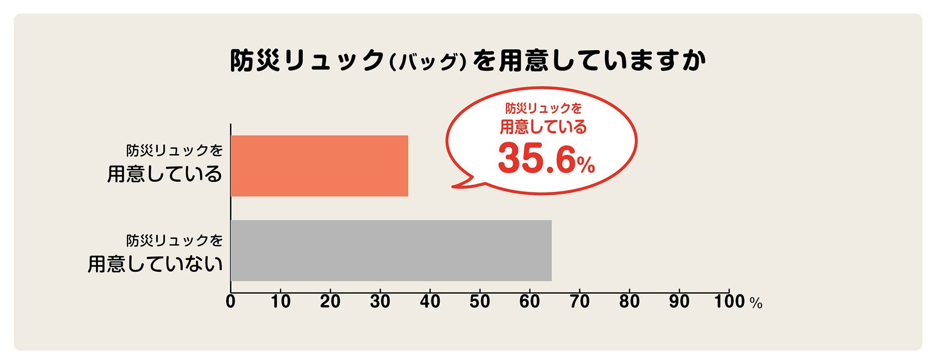 ●「防災リュック(バッグ)を用意している」と回答したのは35.6%のみ。政府などが防災準備の必要性を呼びかけているにもかかわらず、64.4%の人が未準備であることが判明。