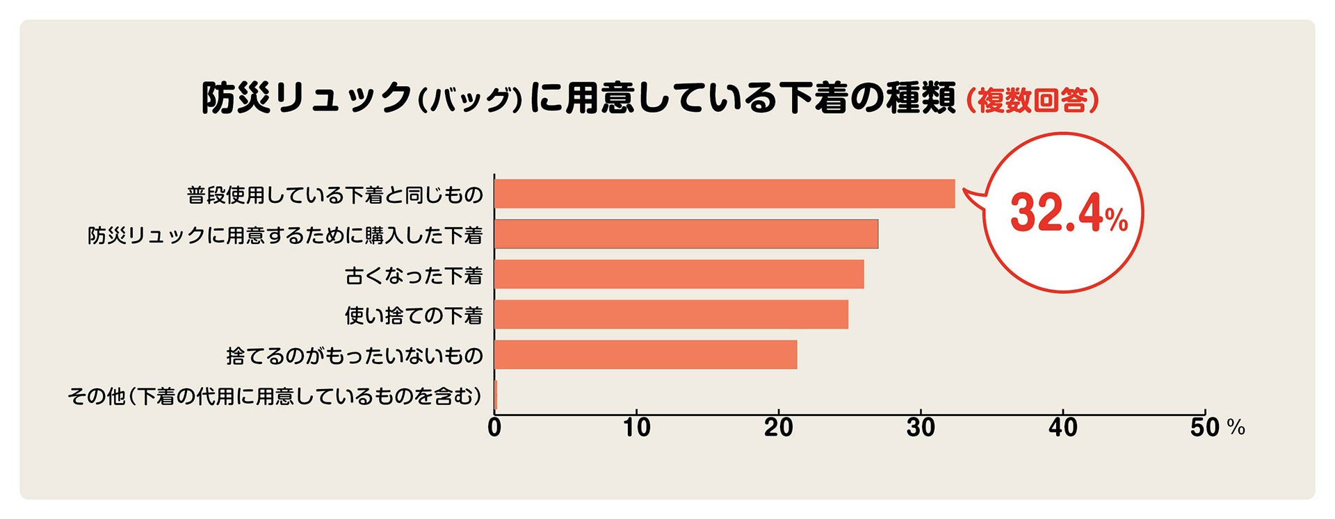 防災リュック(バッグ)に下着を用意している人を対象に「用意している下着の種類は何ですか?」(複数回答)という質問には、「普段利用している下着を同じもの(32.4%)」「防災リュックに用意するために購入した下着(27.0%)」「古くなった下着(26.0%)」